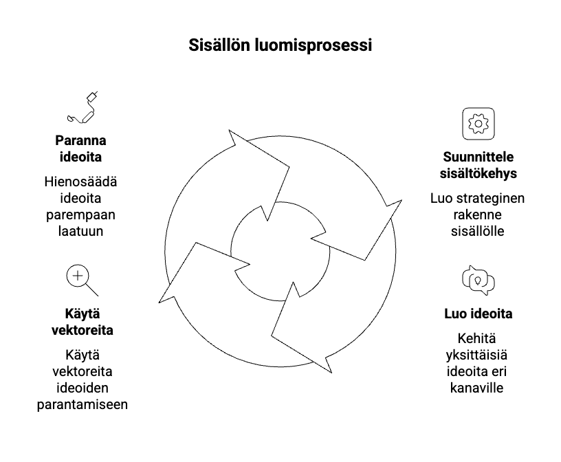 Tässä vaiheessa syntyy sisältösuunnitelma, joka määrittelee ideat, kohderyhmät, CTA:t ja avainsanat – kaikki linkitettynä takaisin strategiaan.